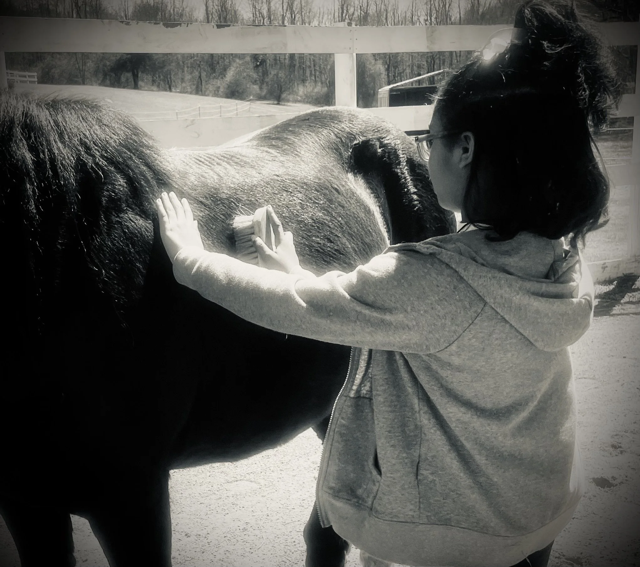 -Mindful Grooming Sessions: Leave the outside world at the barn door! Working with a horse is an exceptional way to develop and deepen a practice of calmness and intention, of becoming aware of our swirling thoughts and learning how to focus on being present in the moment. The act of grooming a horse creates a powerful, restorative connection that engages the senses, lowers blood pressure and heart rate, increases happiness and decreases stress.