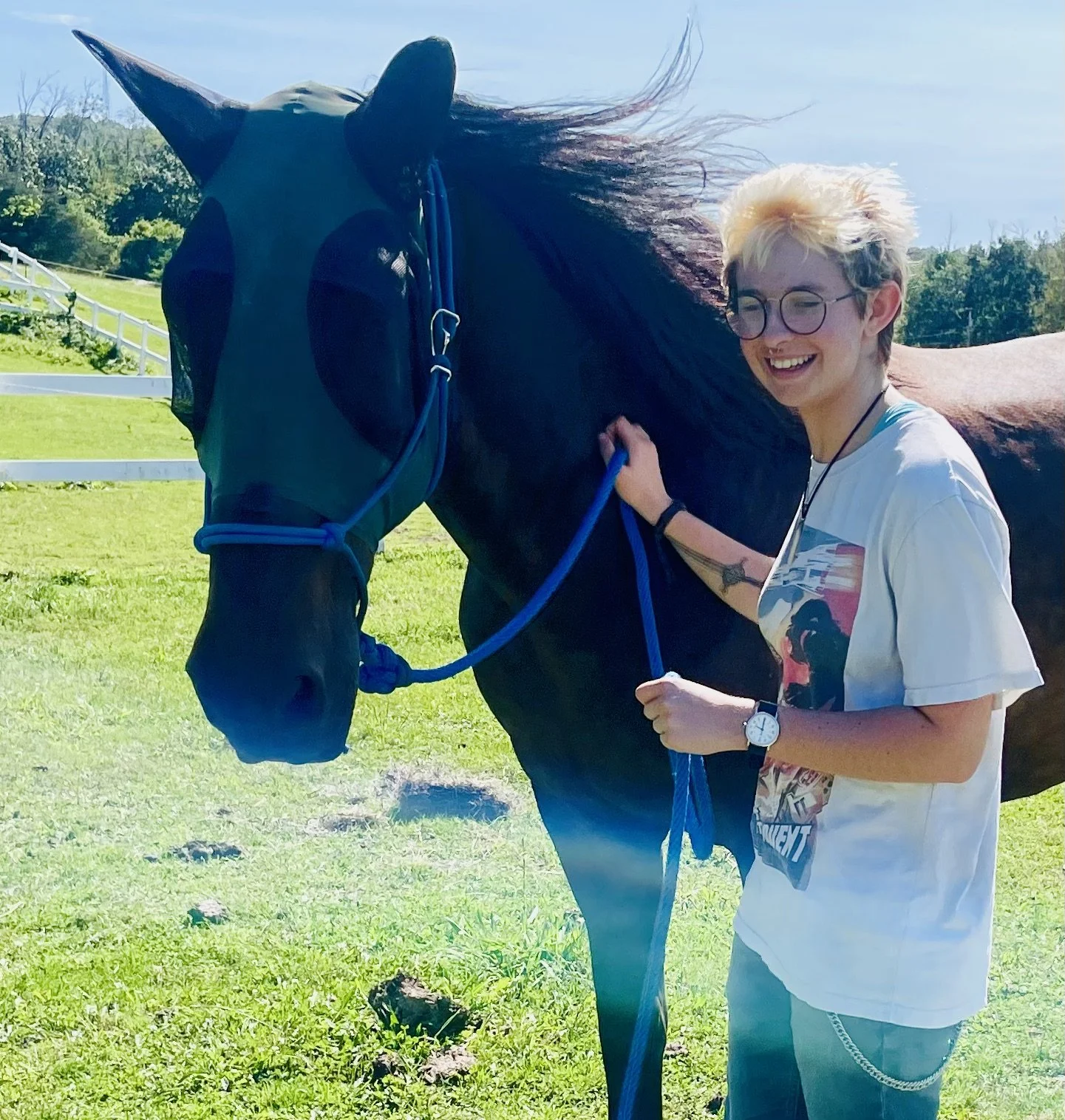 -Mindful Horsemanship Lessons: Students learn to interact with horses in a safe, trusting, mutually respectful way. Includes grooming, general care, equine education. Students may also work up to leading and handling with a halter and lead rope and liberty work.